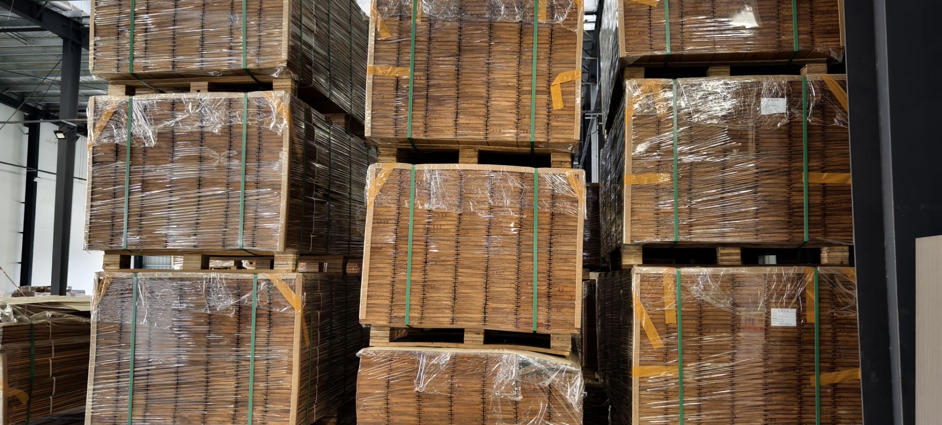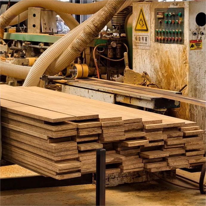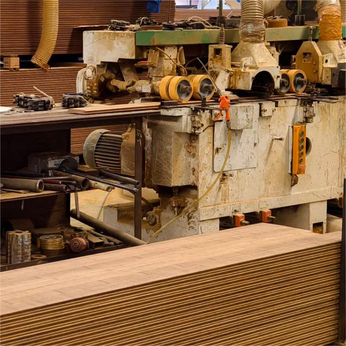 Drying 根据竹材的厚度和湿度进行调整烘干时间,将竹材的水分含量降低到适宜的水平,确保重竹地板在使用过程中不会因湿度变化而变形或开裂 Adjust the drying time according to the thickness and humidity of bamboo, reduce the moisture content of bamboo to an appropriate level, and ensure that heavy bamboo flooring will not deform or crack due to humidity changes during use |